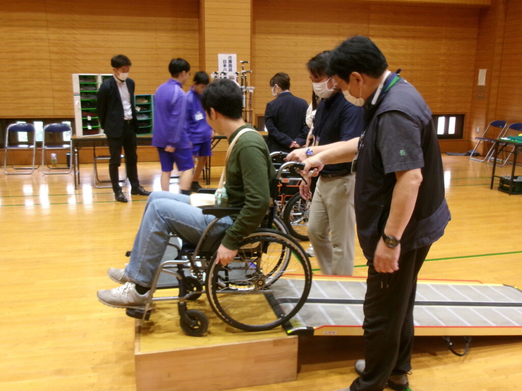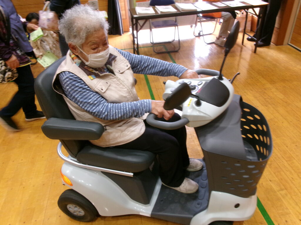 今年も三山市民センターにて、三田習地区社会福祉協議会主催のみたなら福祉フェアに参加し、高齢者体験や車いすの試乗体験コーナーを実施しました。普段、車いすに乗ったことのない方には、車いすを漕いで動かすのは難しく、レクチャーを受けて坂道を上る困難さを実感していました。高齢者体験では、サポーターやゴーグルをつけていただき、視野の狭さや足腰の動きにくさを体験していただき、体験者の方は思っていた以上に動きにくいと話す方が多かったです。