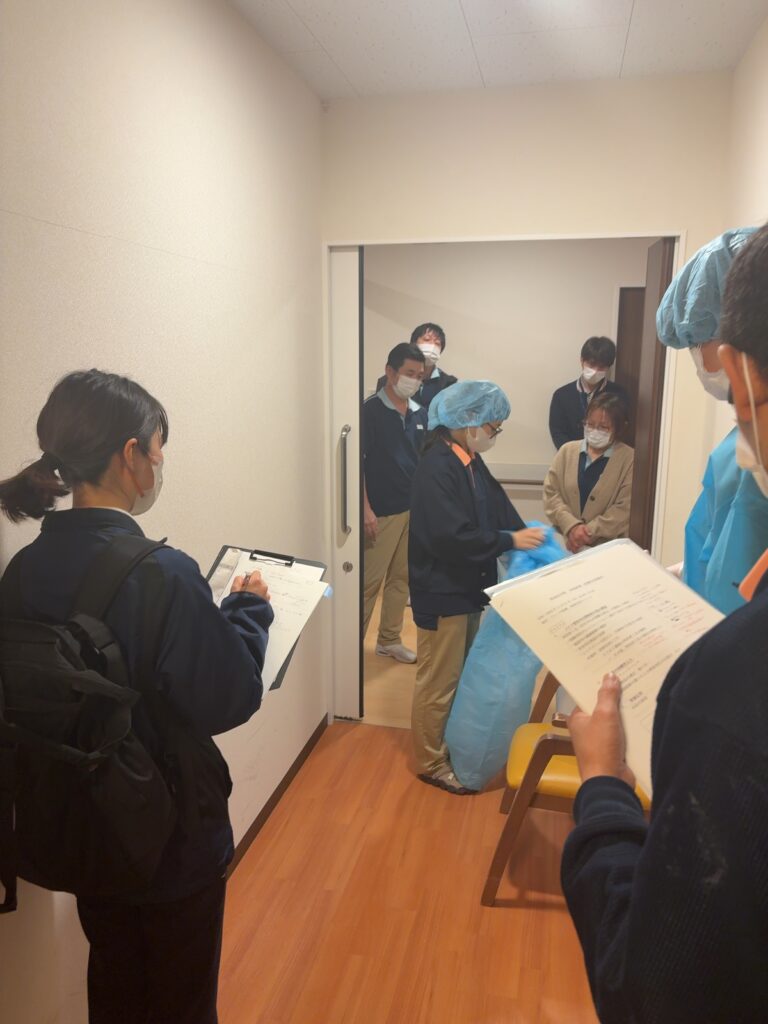 内容は、施設内にてコロナウィルスやインフルエンザ等の感染症がもし起きた場合、現在の感染症対策マニュアルで適切に対応できているのかどうか、シミュレーションを行いながら専門家に評価をしていただくこととしました。具体的には、感染症に罹患した入居様の居室へ入る時、退室する時の予防着の着脱、居室内での食事および排泄介助を実際に職員が行い、感染を広げないことを徹底できるよう復習しました。